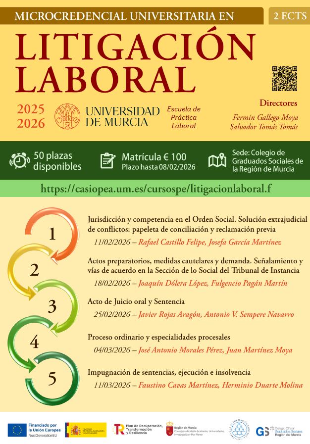 El número de plazas es limitado (50). Se atenderá al orden de matrícula. Si estas interesado puedes inscribirte a través de este enlace: https://casiopea.um.es/cursospe/litigacionlaboral.