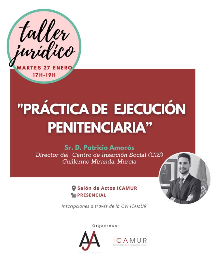 Os informamos que la Agrupación Joven de la Abogacía del ICAMUR ha organizado una Taller Jurídico titulado: “PRÁCTICA DE EJECUCIÓN PENITENCIARIA”, que tendrá lugar el martes día 27 de enero, de 17:00 a 19:00 horas, en el Salón de Actos del ICAMUR.